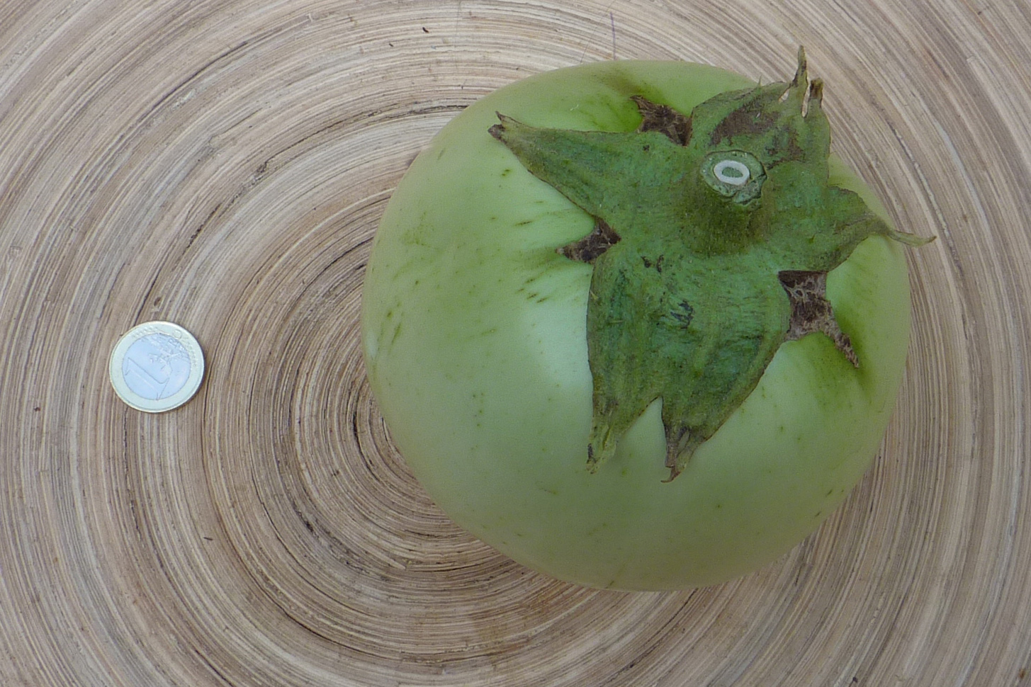 Grün- Hellgrüne oval runde 6 -12 cm große, festfleischige Aubergine. Bei der Saatgutreife verfärbt sich die Fruchte gelb.