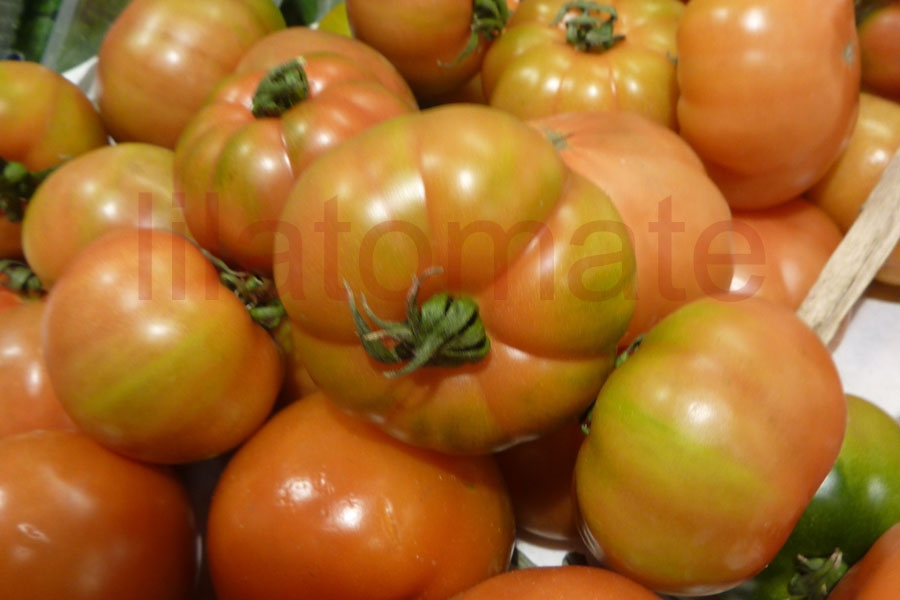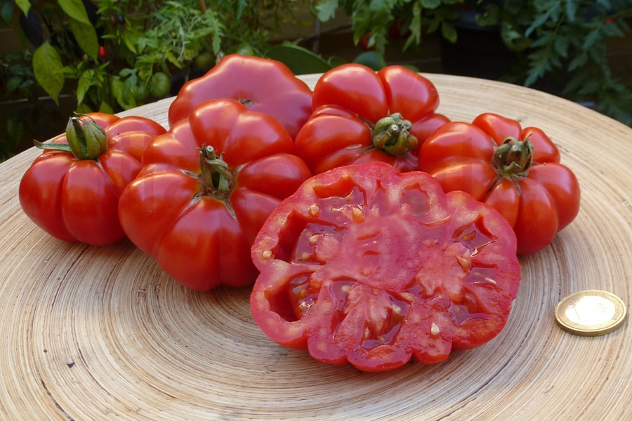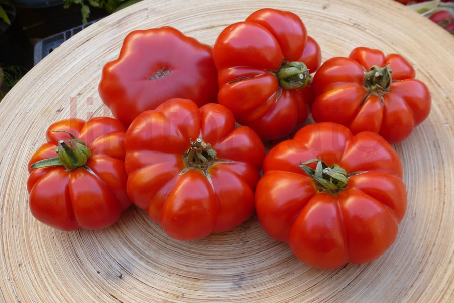 Flachrunde, regelmäßig gebuchtete, 5 – 8 cm große Tomate, saftig würzig. Früher, guter Ertrag, schöne Früchte.