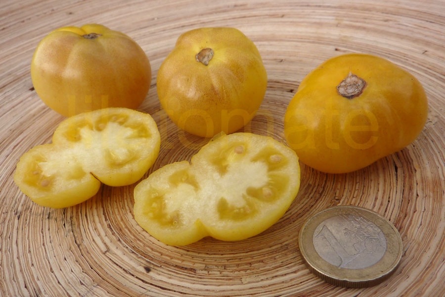 Gelbe Minifleischtomate mit sehr frühem Ertrag von Anfang Juli bis Ende September im Freien. Die hübschen, süßen, fruchtig-würzigen Früchte sind 3 - 5 cm groß, hellgelb, flachrund und leicht gebuchtet. Früchte reifen gut nach und sind weitgehend platzfest.