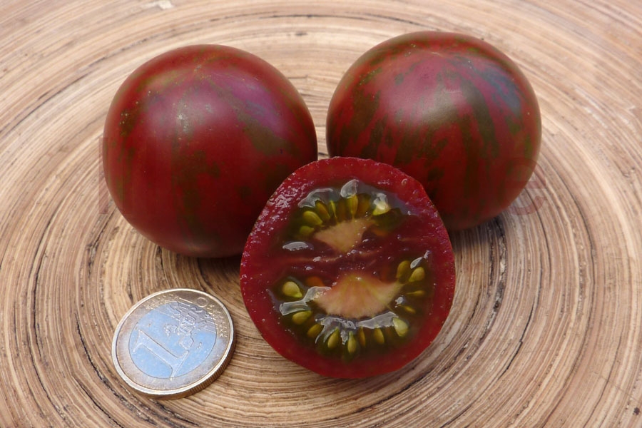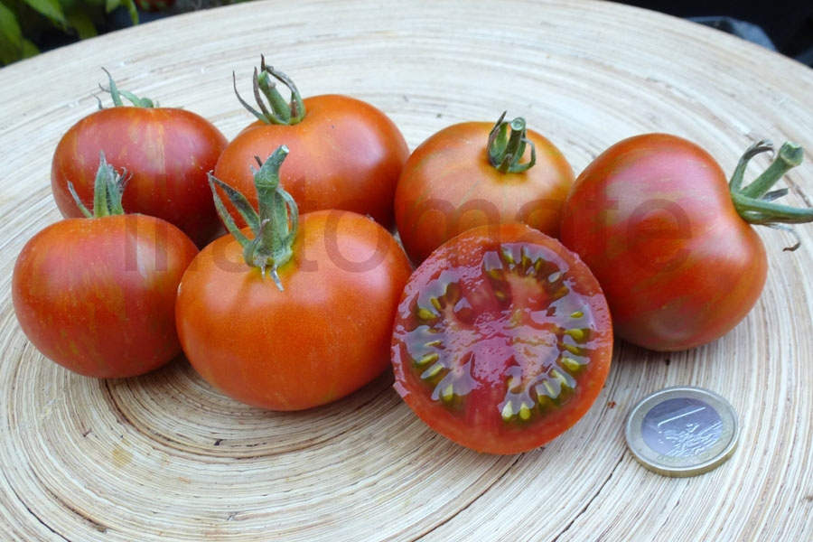 Mittelfrühe und lange tragende, mittelgroße, hübsche rote, braun oder rotgelb gestreifte Tomate. Gutes süß-würziges Aroma. Relativ platzfest, braucht ein Regendach. Manche Früchte sind weiche, manche sind fester. 1,8 m Stabtomate mit wenigen Geiztrieben. Die rotgelbgestreifte hatte 2022 einen guten Ertrag im Freiland.