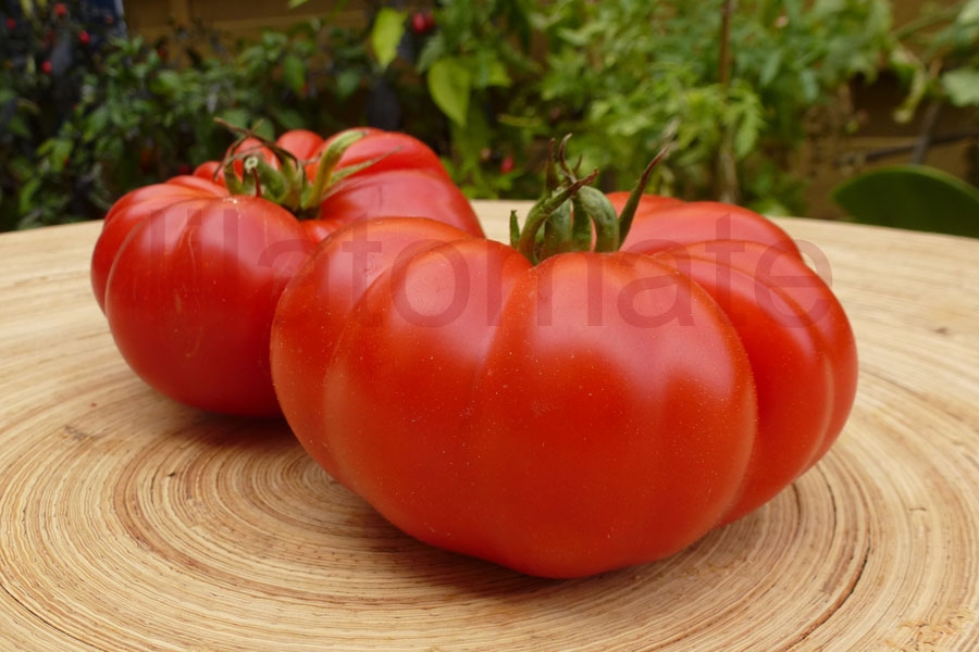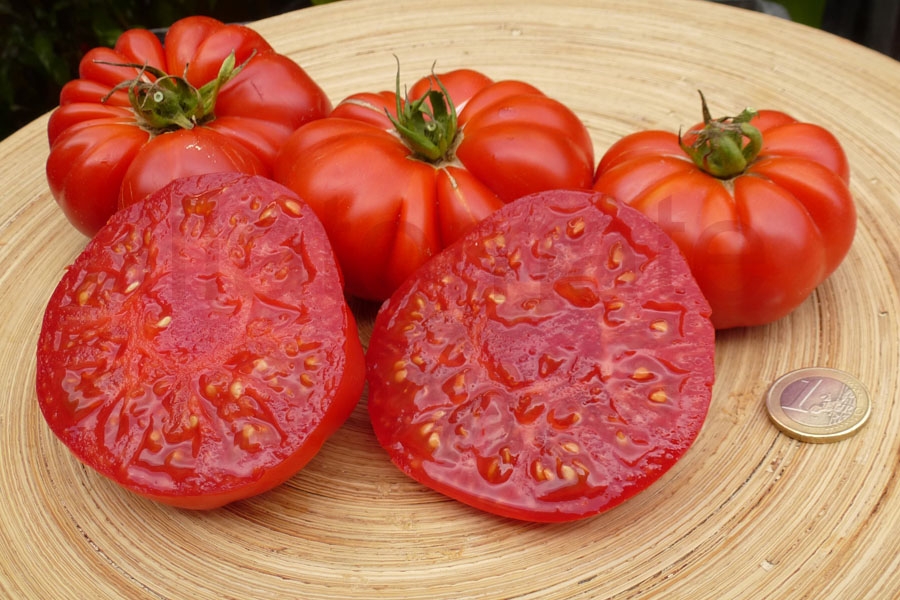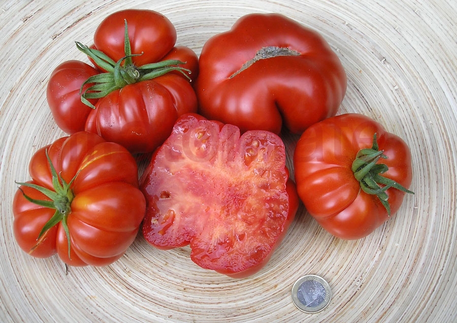Tiefdunkelrote, gefurchte, flach-runde, 6 – 12 cm große, saftige Fleischtomate mit gutem, süß-würzigen Geschmack.Ich habe die Sorte 2008 von Freie Saaten (www.freie-saaten.org) bekommen und hatte erst im Gewächshausanbau 2013 und 2016 eine gute Ernte. Die alte türkische Landsorte braucht etwas mehr Wärme, um dann ihren reichen, sehr aromatischen Ertrag von Ende Juli bis Anfang Oktober zu bringen.