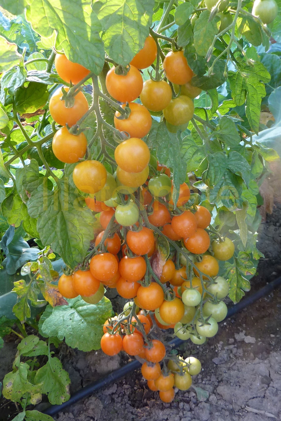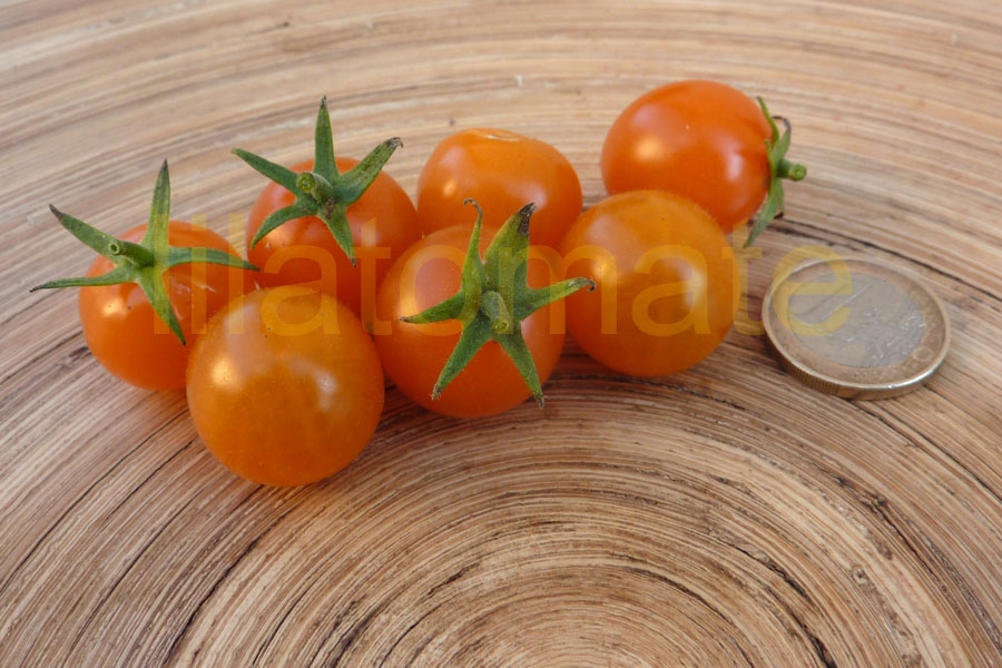 Orange, süß-fruchtige 1,5 – 2 cm kleine Cocktailtomate. Sehr früh und lange anhaltend tragend. Die weichschaligen Früchte platzen leider schnell auf. Ihr Aroma macht diesen Mangel aber wett. Relativ zierliche 1,6 – 2 m hohe pflegeleichte Stabtomate mit wenigen Geiztrieben für den Anbau unter einem Regenschutz.