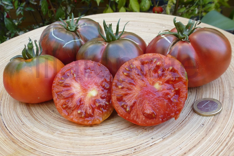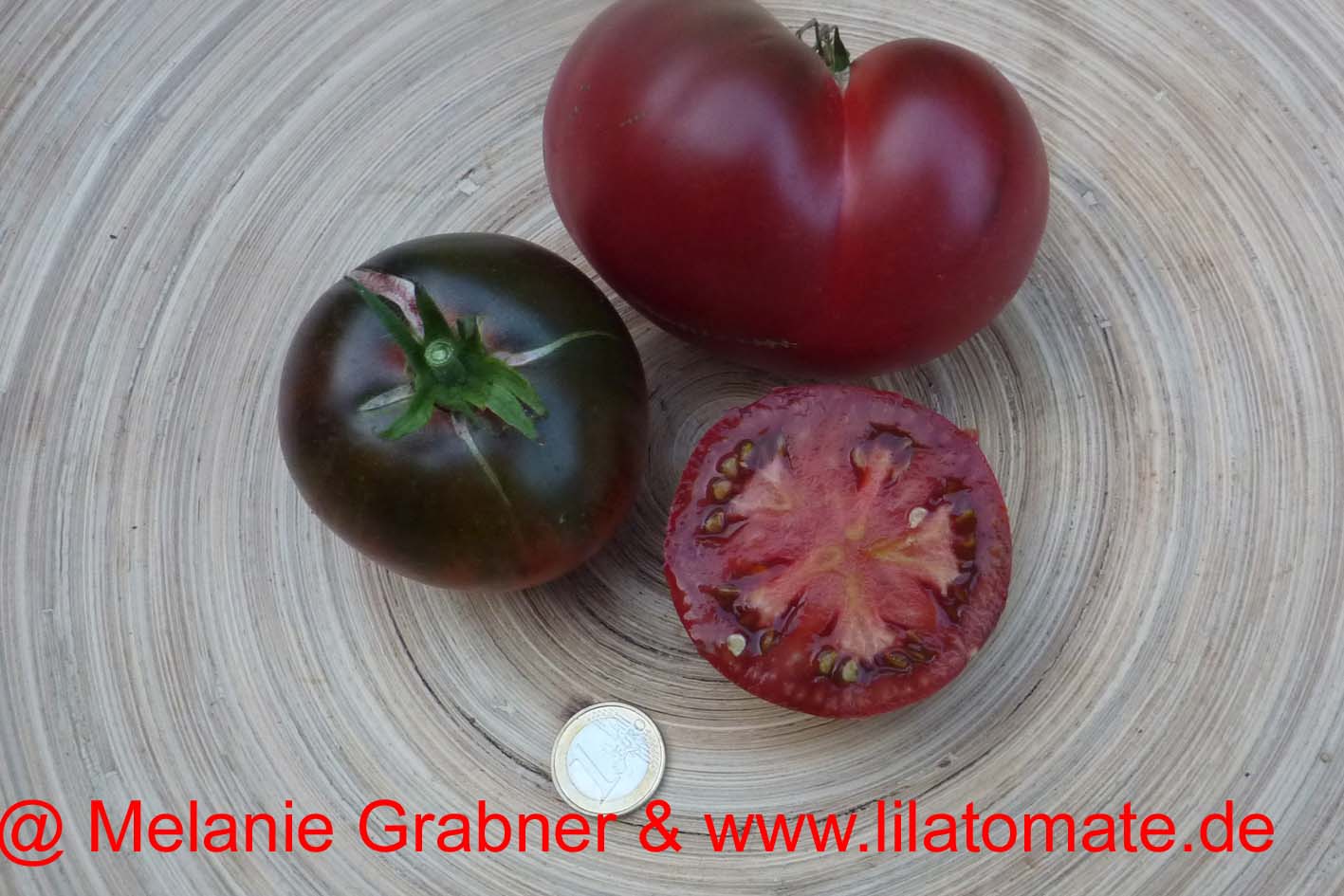 Aromatische rotlila Fleischtomate mit interessanter Violettfärbung und gutem, fruchtigem Aroma. Die 1,4 - 2m hohe Stabtomate bringt einen mittelfrühen guten Ertrag im Gewächshaus. Die dünnhäutigen Früchte brauchen auf jedenfall einen Regenschutz.