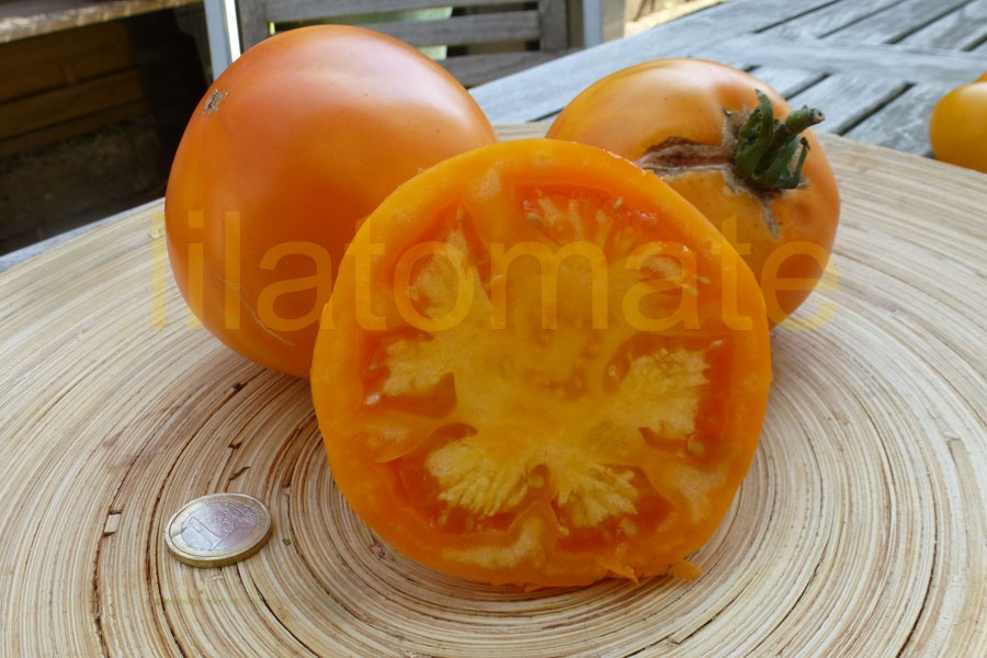 Große orange runde bis flachrunde Ochsenherztomate für warme Lagen. Pflegeleichte Stabtomate für den Anbau unter Dach oder im Gewächshaus.