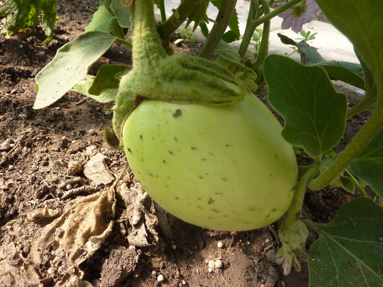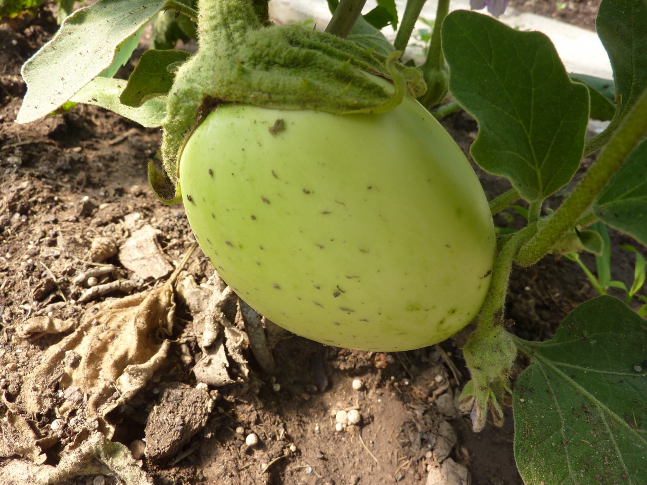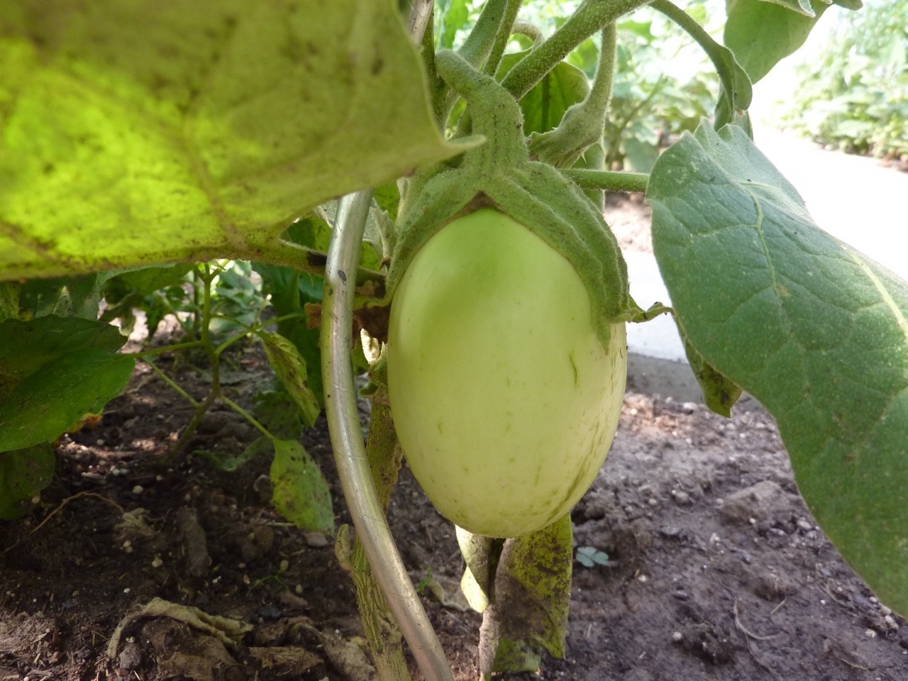 Grün- Hellgrüne oval runde 6 -12 cm große, festfleischige Aubergine. Bei der Saatgutreife verfärbt sich die Fruchte gelb.