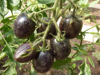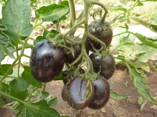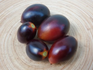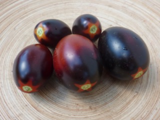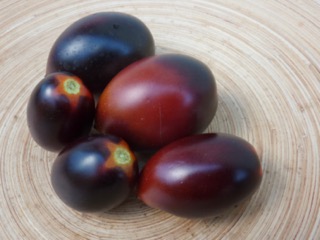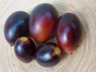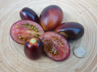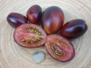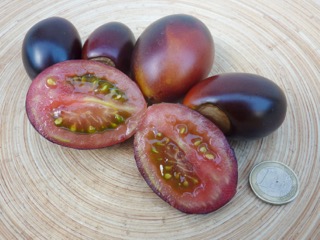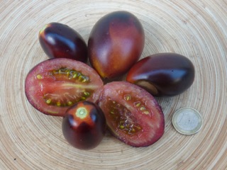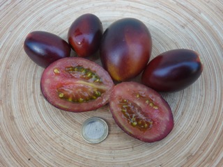 Ich baute sich dann im Gewächshaus an. Die 1,8m hohen Stabtomaten brachten schöne blaurote, blauorange längliche Eiertomaten mit fruchtig würzig süßem Geschmack. Das Fruchtfleisch ist dunkel rotbraun. Einige Früchte sind schwach gestreift. Die Ernte war früh und lange. Ideal für Frischverzehr, Salate, Soßen.
