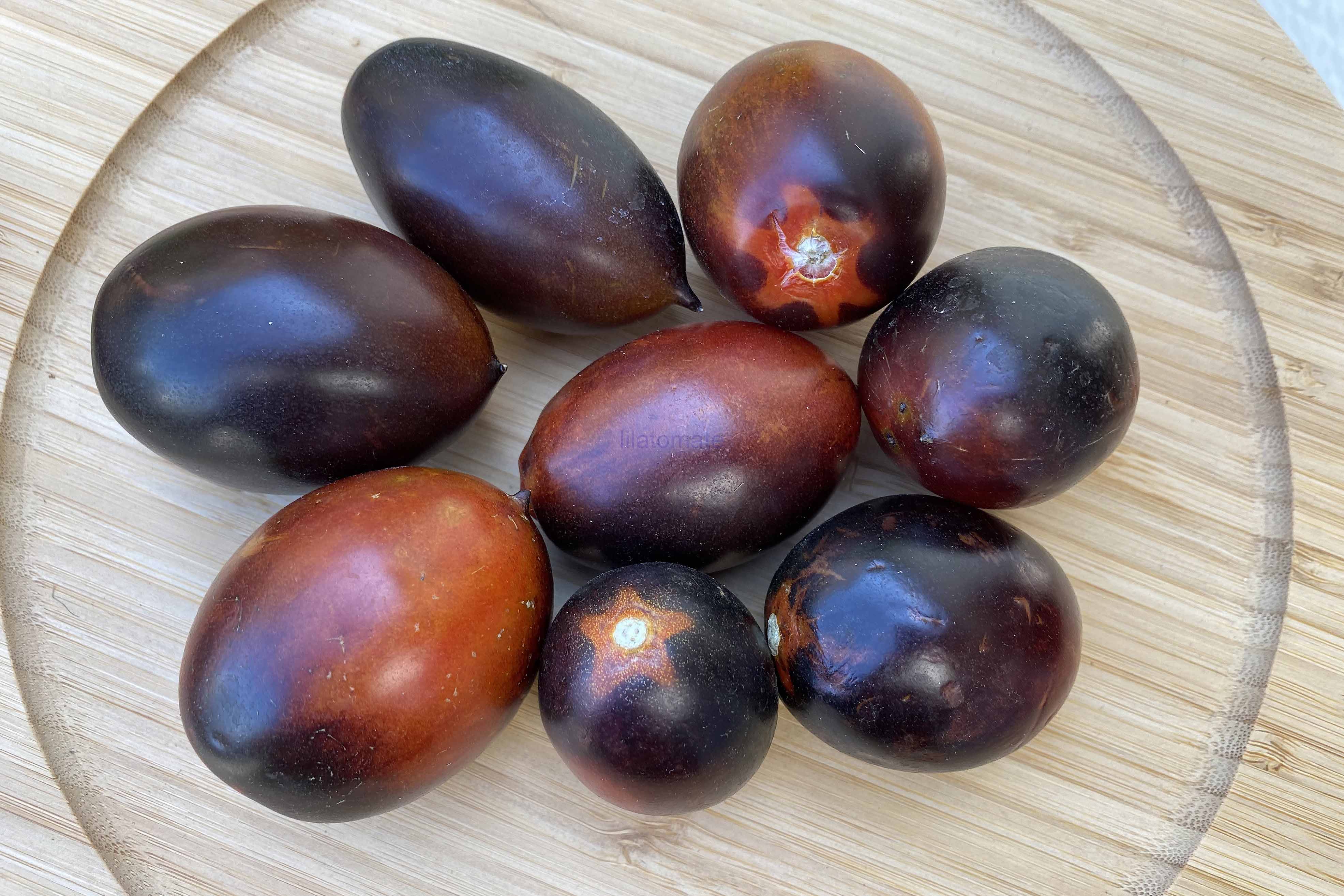 Diese Tomate kaufte ich 2020 als Frucht in einem Globus Supermarkt und sähte sie 2024 aus. Mir gefielen die ovalen dunkelblaurot orangen Früchte die ausreichend schnittfest und saftig zugleich sind. Sie keimten sehr gut und entwickelten sich zu prächtigen Jungpflanzen.