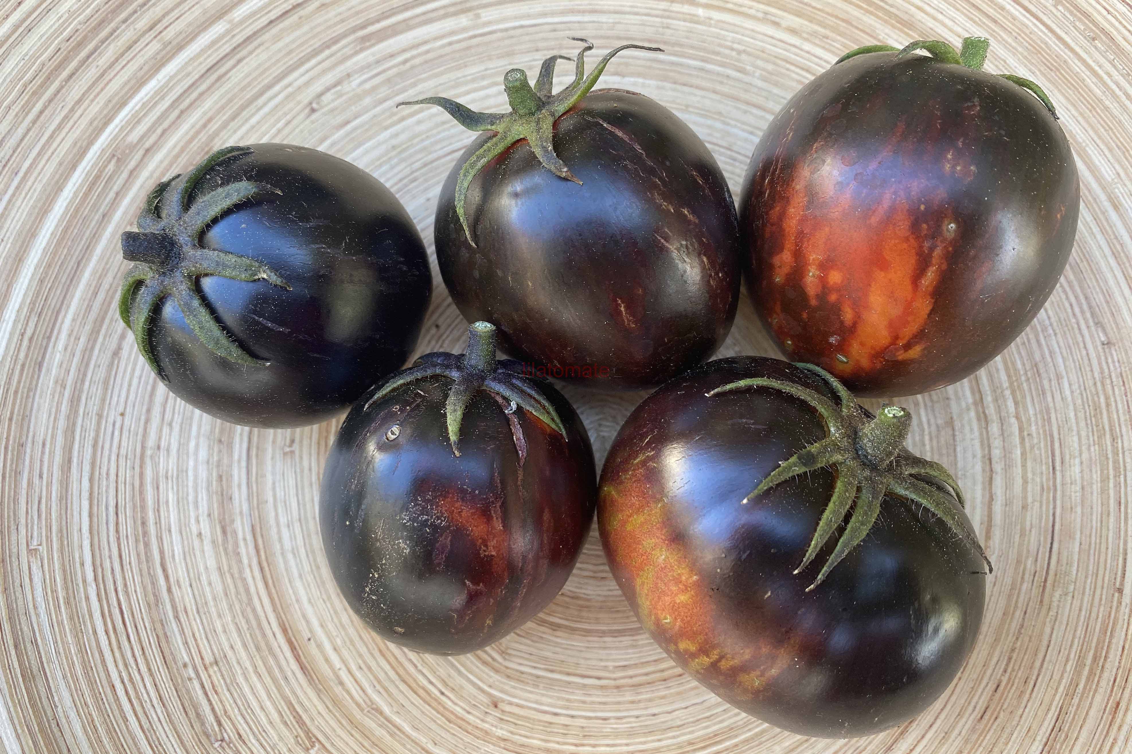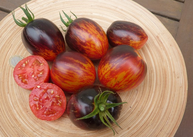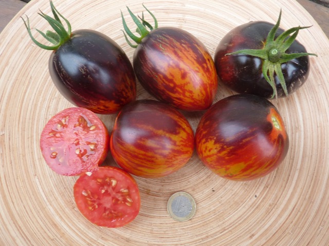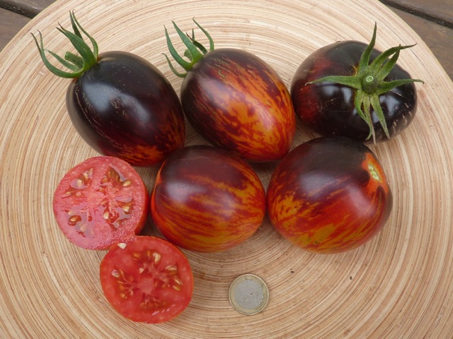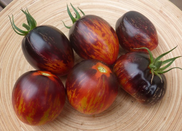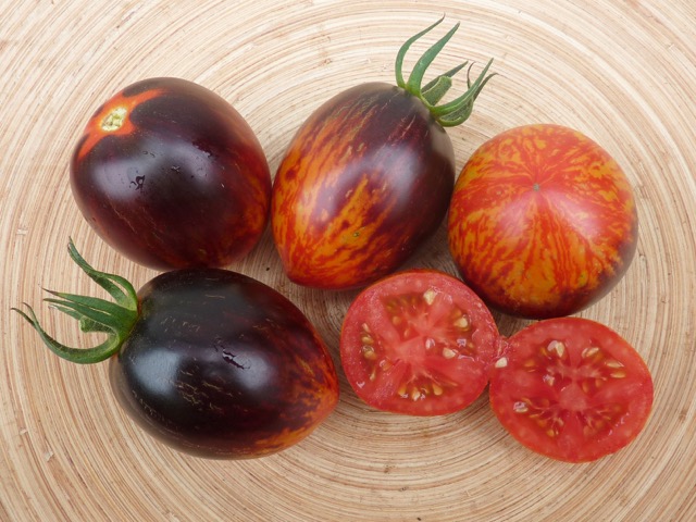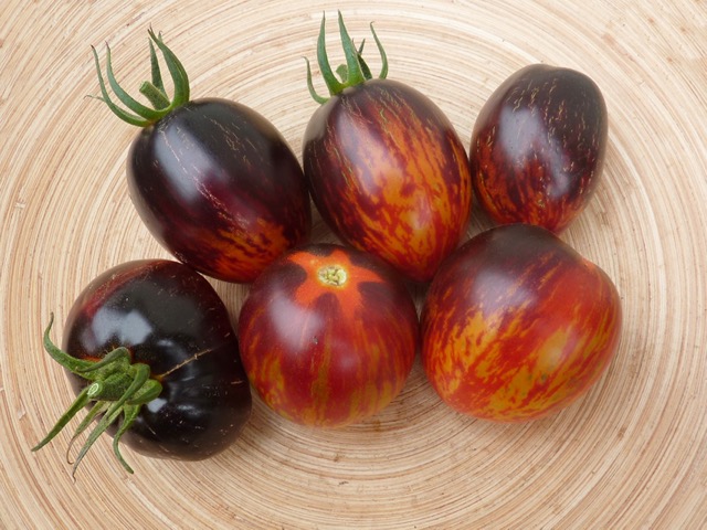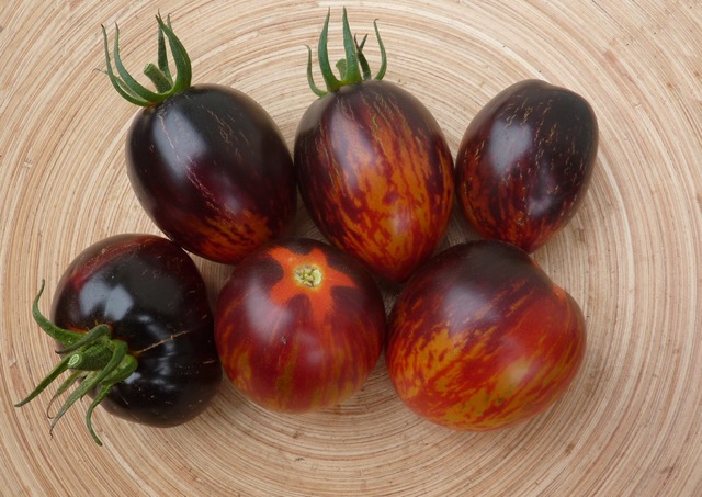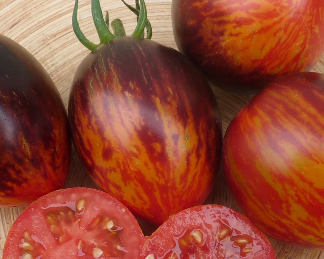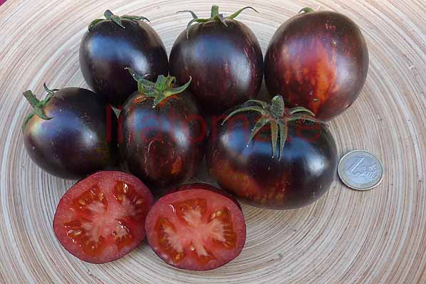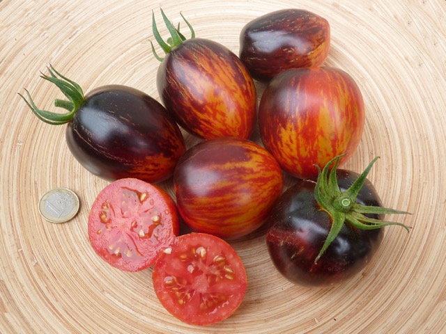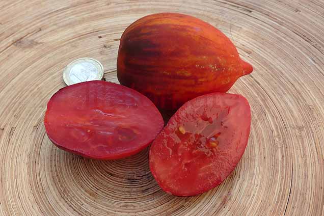 5-10 cm ovale violet braun rot gestreifte Tomaten mit tiefrotem Fruchtfleisch und fruchtig süßem Aroma. Die 1,6 -2m hohe Stabtomate trug bei mir 2023 im Gewächshaus sehr gut von Mitte Juli bis zum Frost Ende Oktober. Die Früchte reifen gut nach.