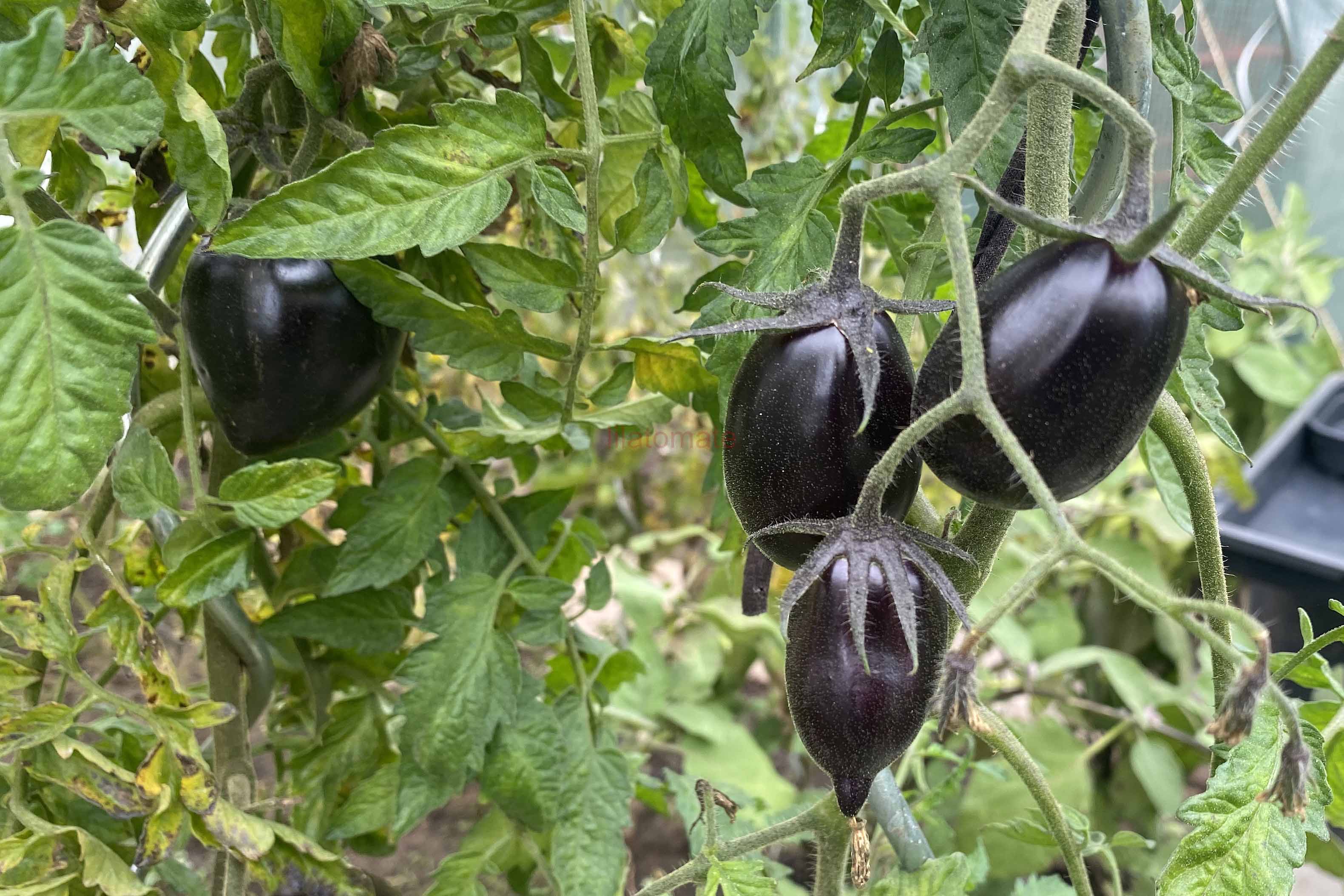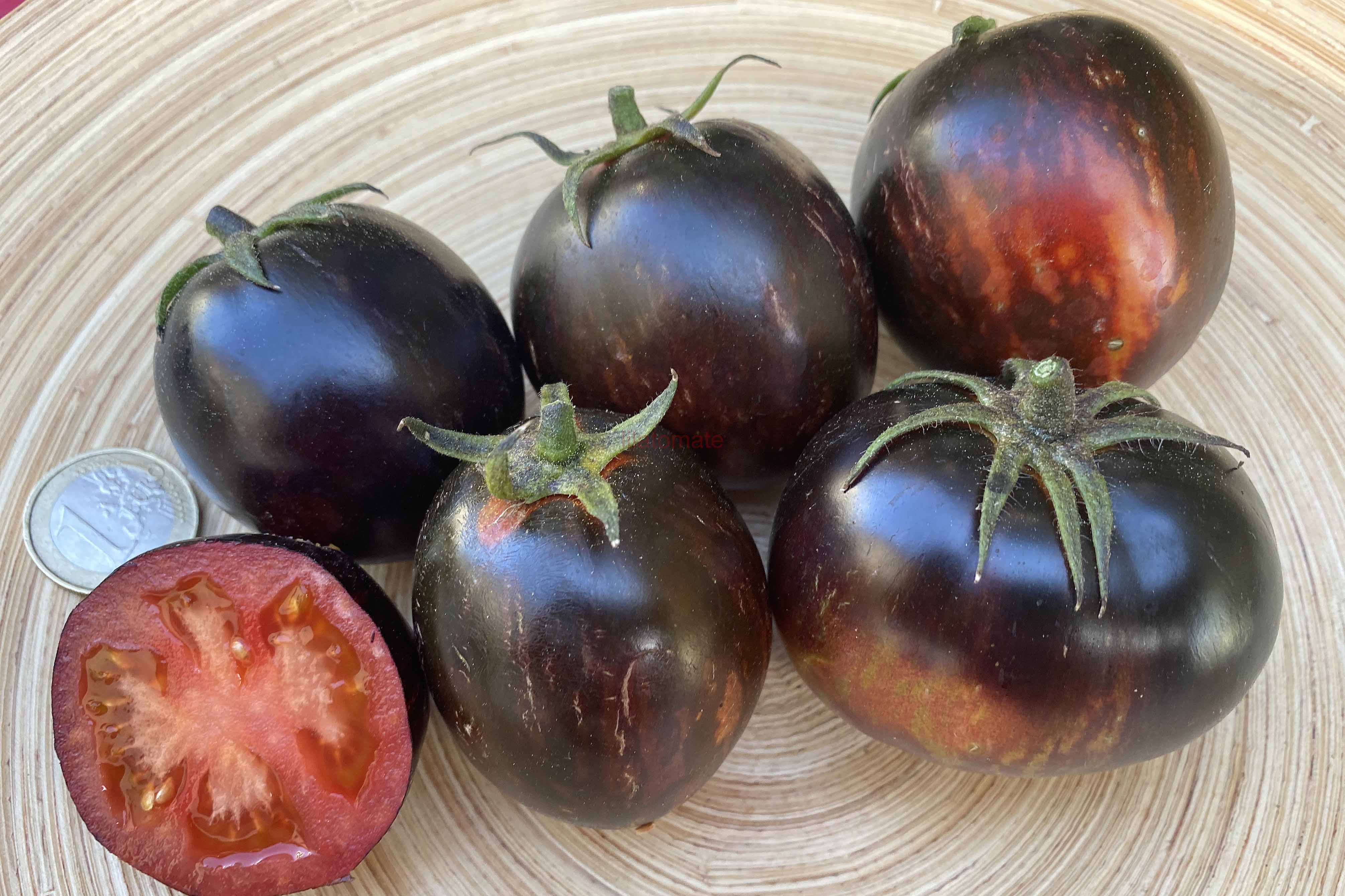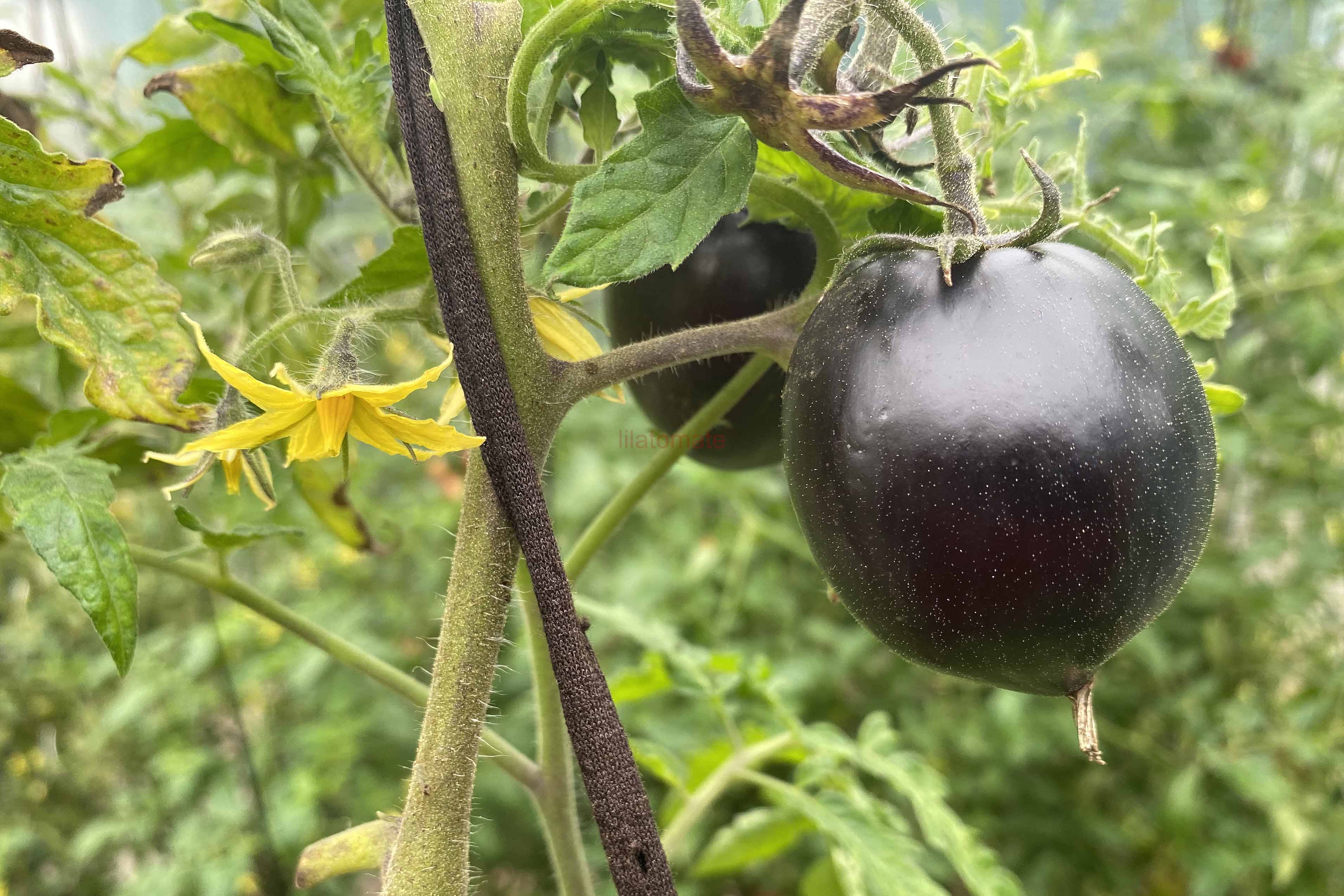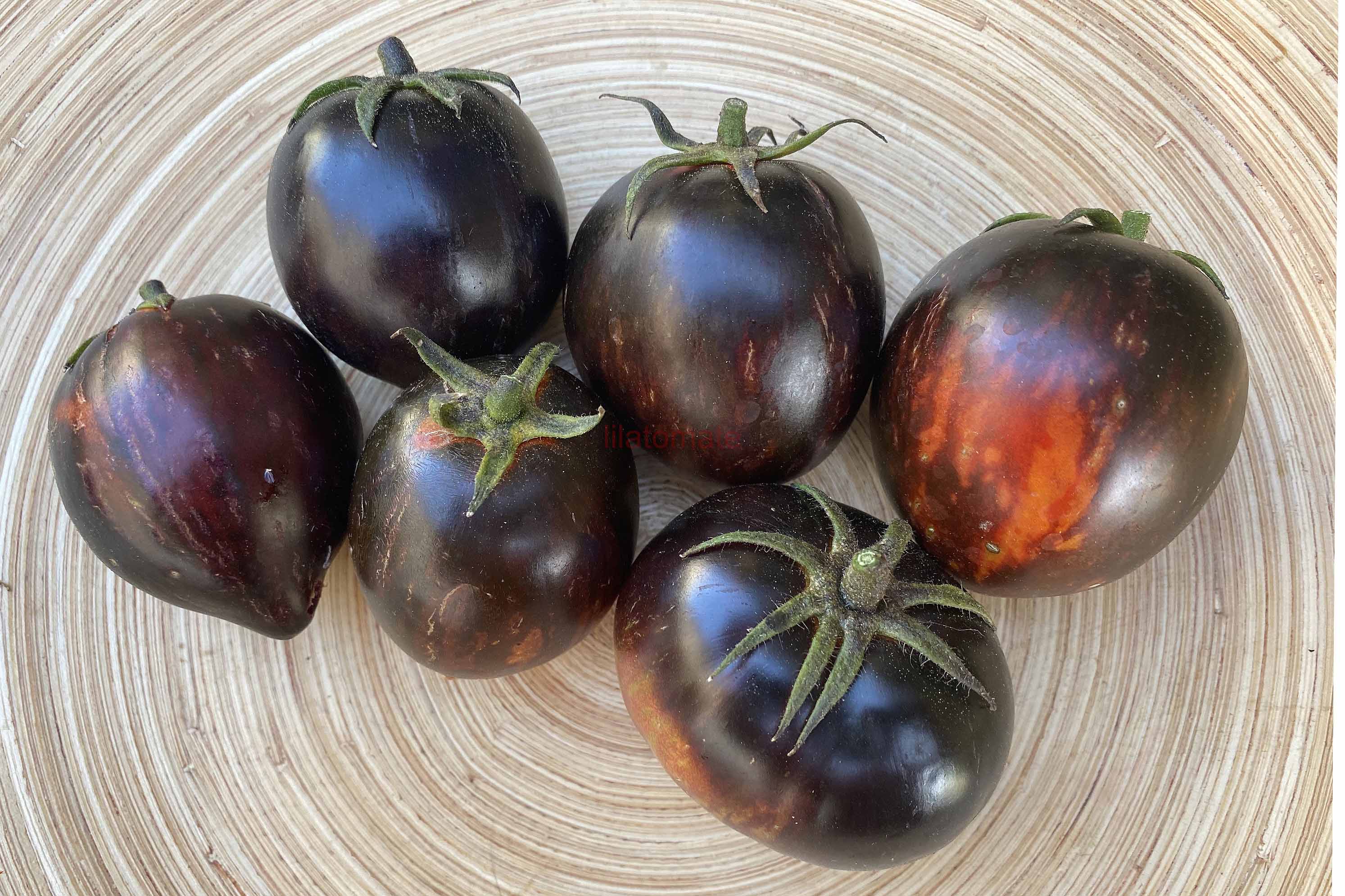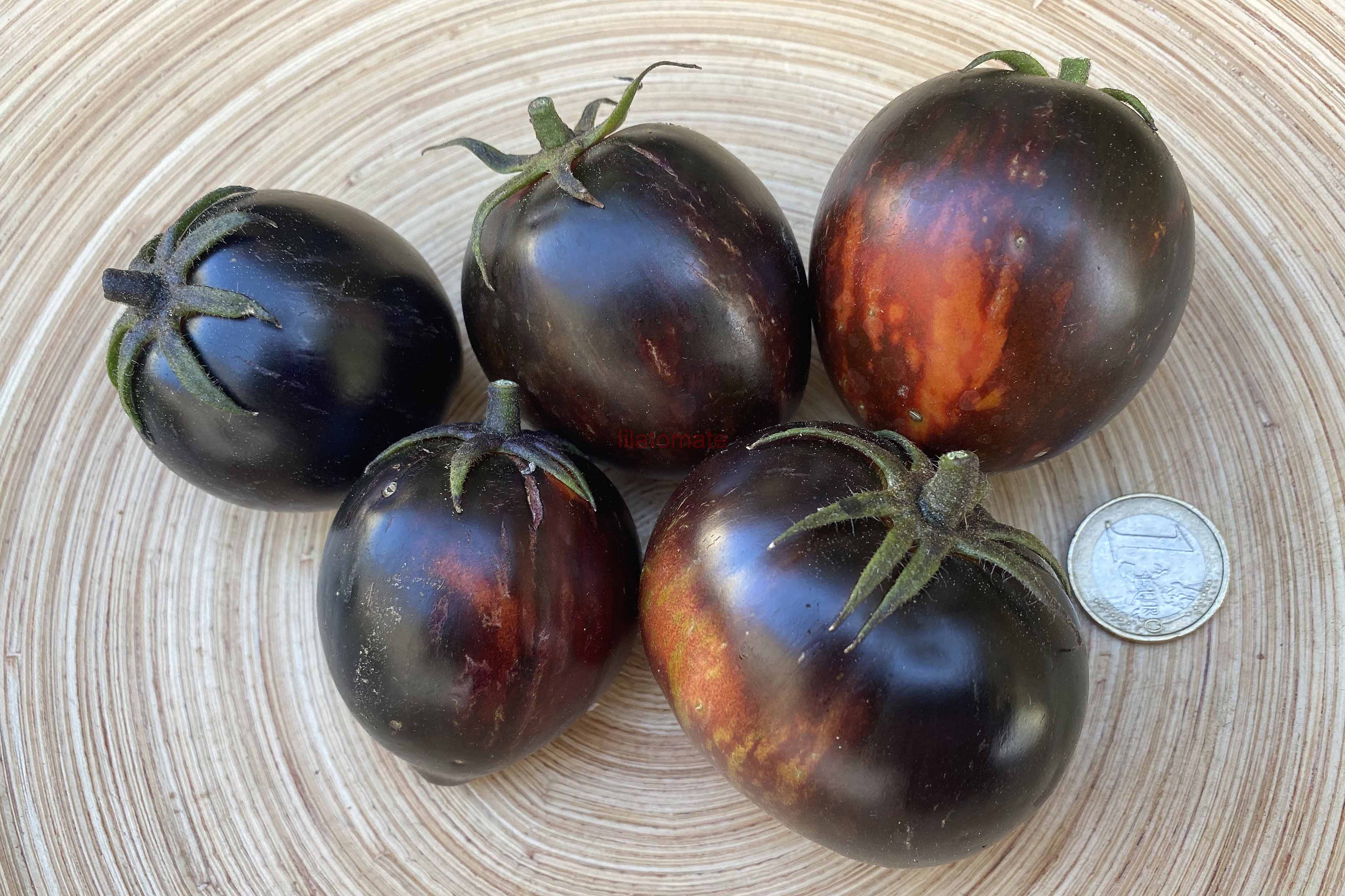 5-10 cm ovale violet braun rot gestreifte Tomaten mit tiefrotem Fruchtfleisch und fruchtig süßem Aroma. Die 1,6 -2m hohe Stabtomate trug bei mir 2023 im Gewächshaus sehr gut von Mitte Juli bis zum Frost Ende Oktober. Die Früchte reifen gut nach.