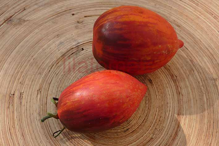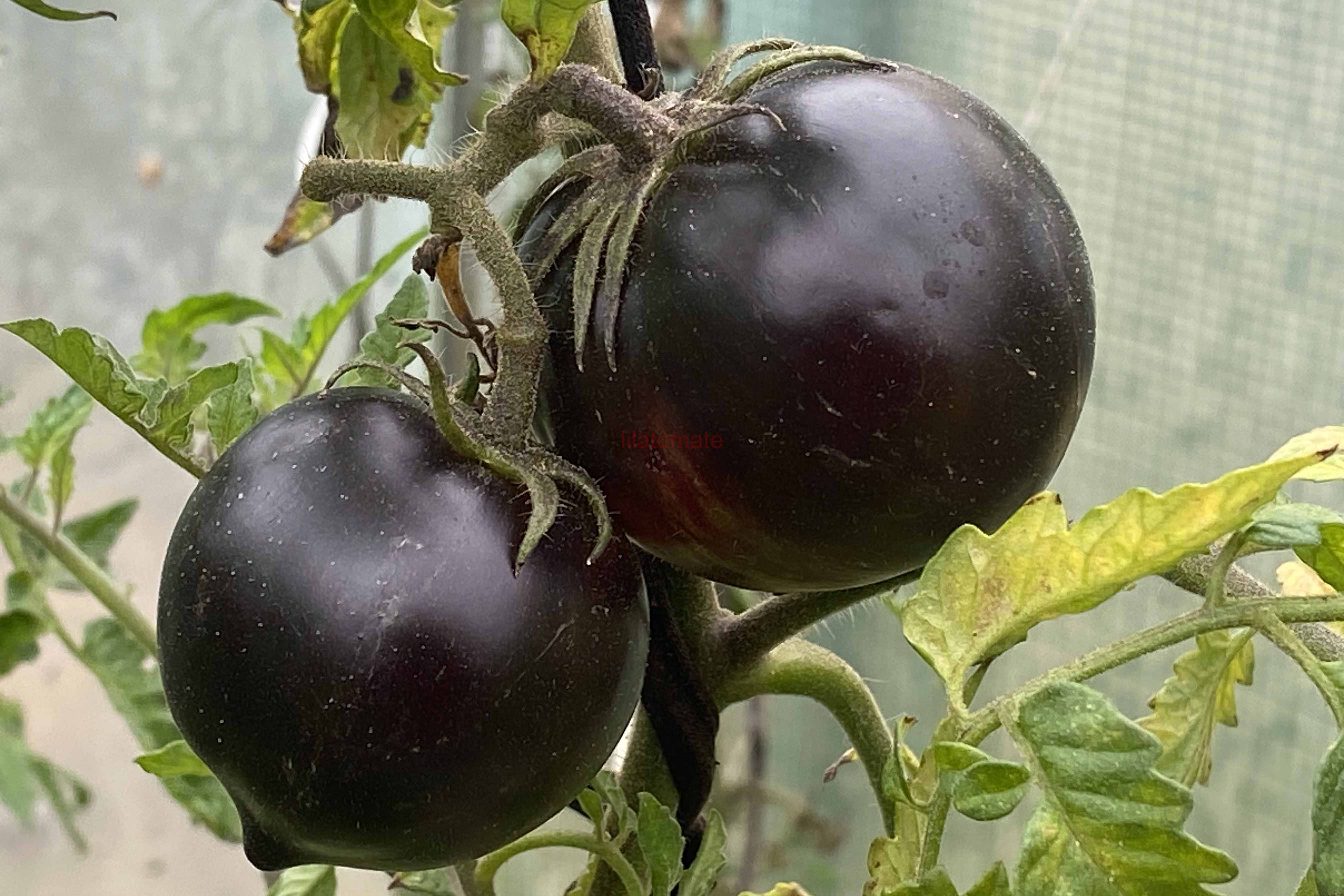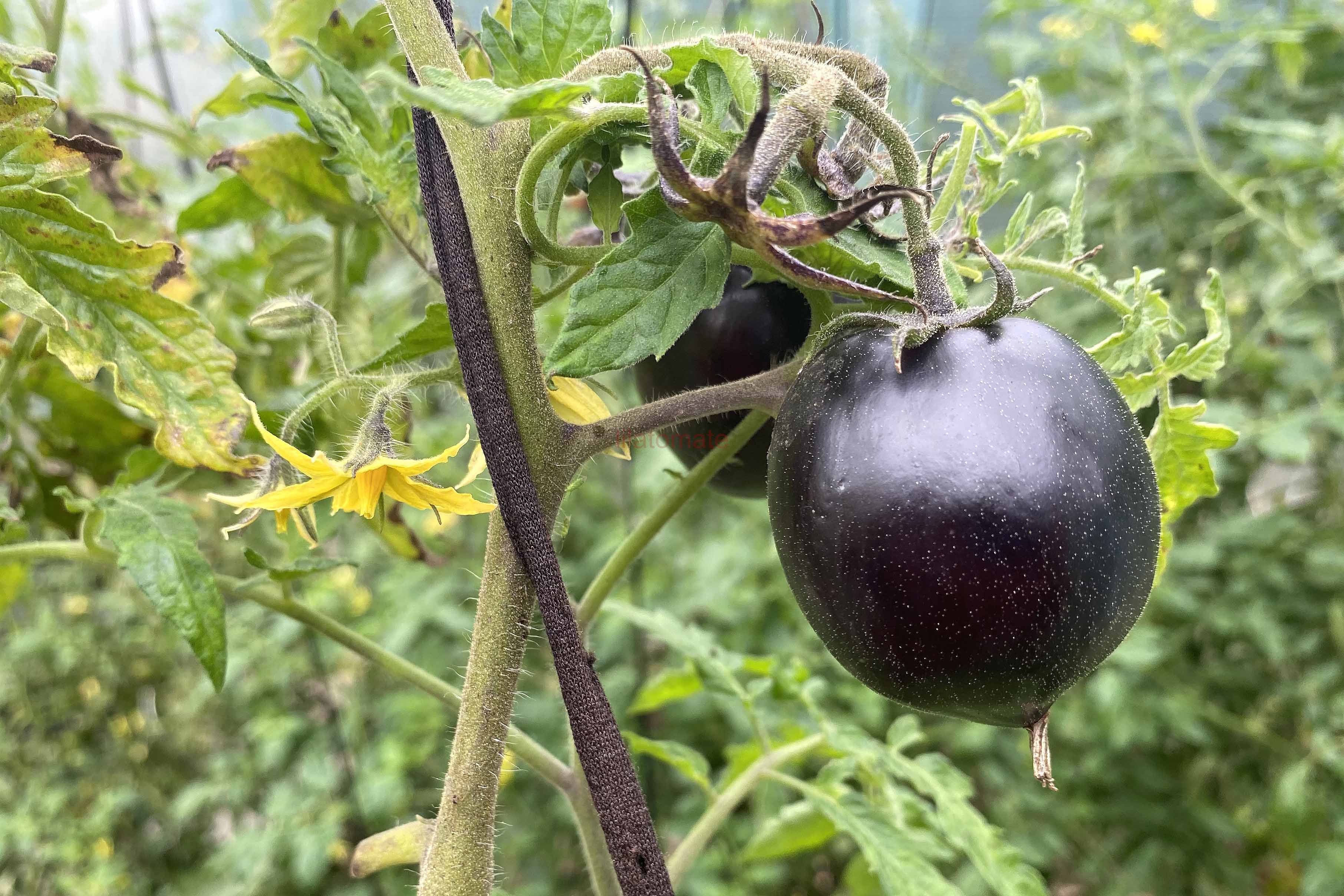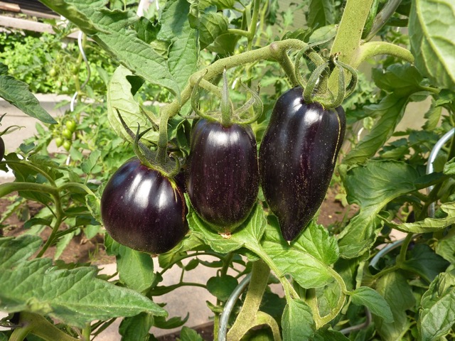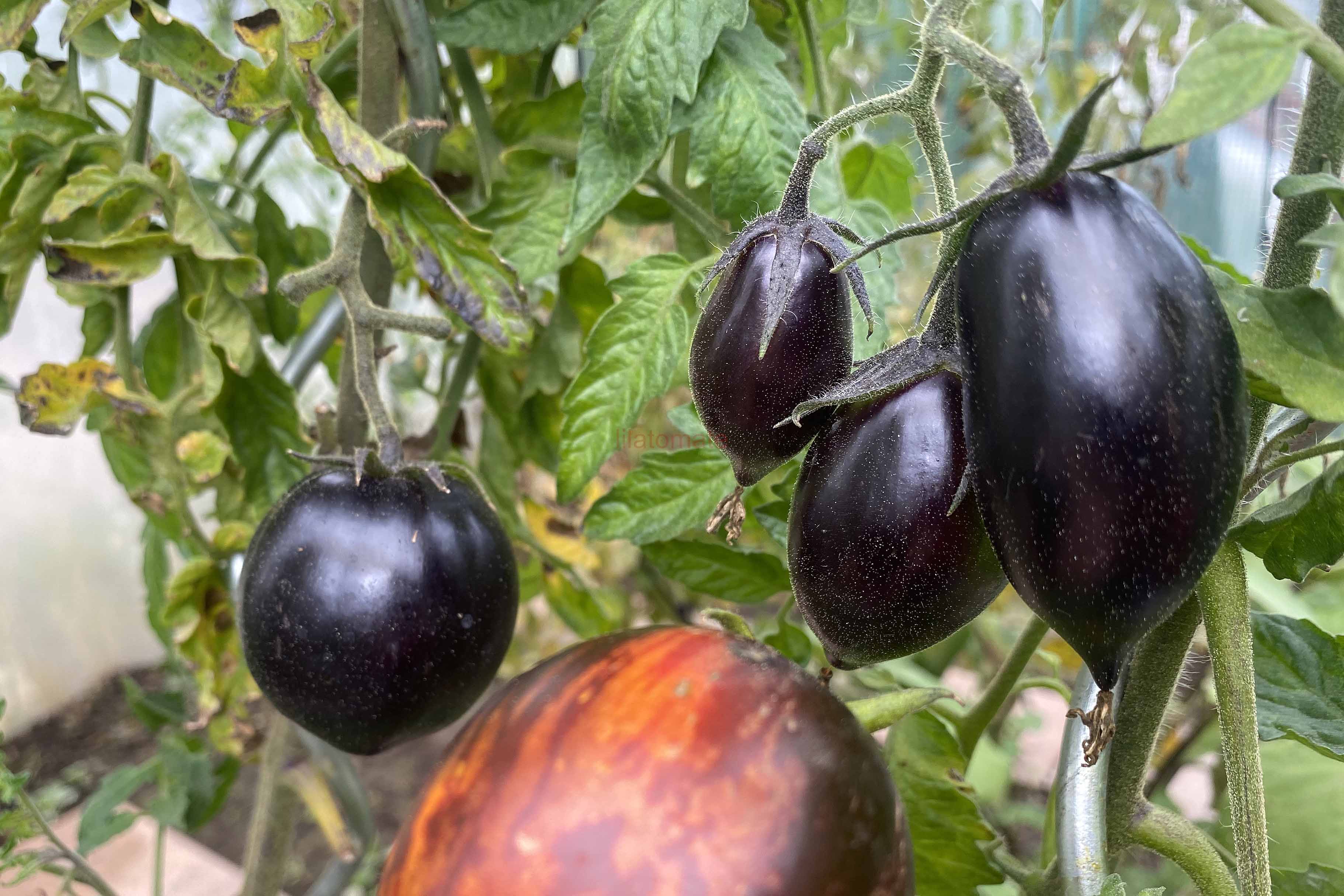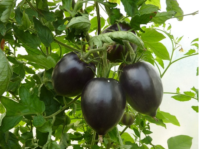 5-10 cm ovale violet braun rot gestreifte Tomaten mit tiefrotem Fruchtfleisch und fruchtig süßem Aroma. Die 1,6 -2m hohe Stabtomate trug bei mir 2023 im Gewächshaus sehr gut von Mitte Juli bis zum Frost Ende Oktober. Die Früchte reifen gut nach.