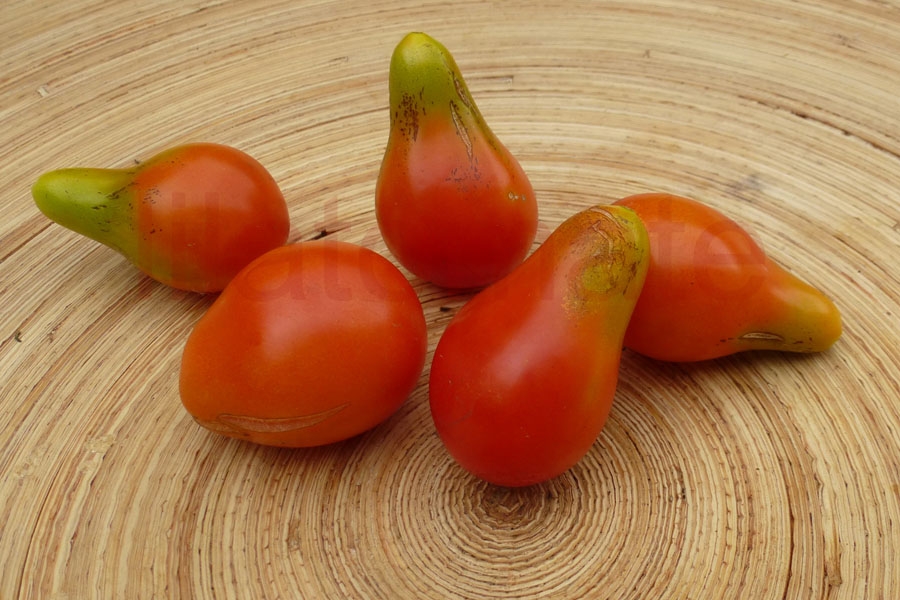 Die birnenförmige, rote Cocktailtomate hat 2 - 3 cm lange, schön geformte Früchte und trägt sehr gut. Die hübsche Frucht kann mit anderen birnenförmigen Cocktailtomaten dekorativ angerichtet werden. Ihr Geschmack ist würzig fruchtig. Süße hat sie kaum.