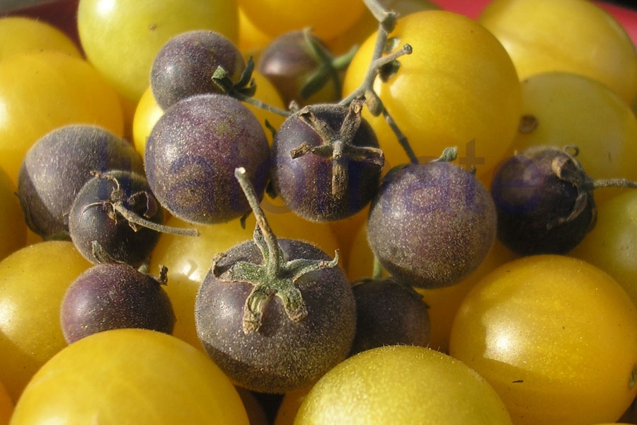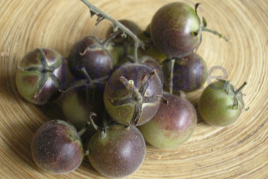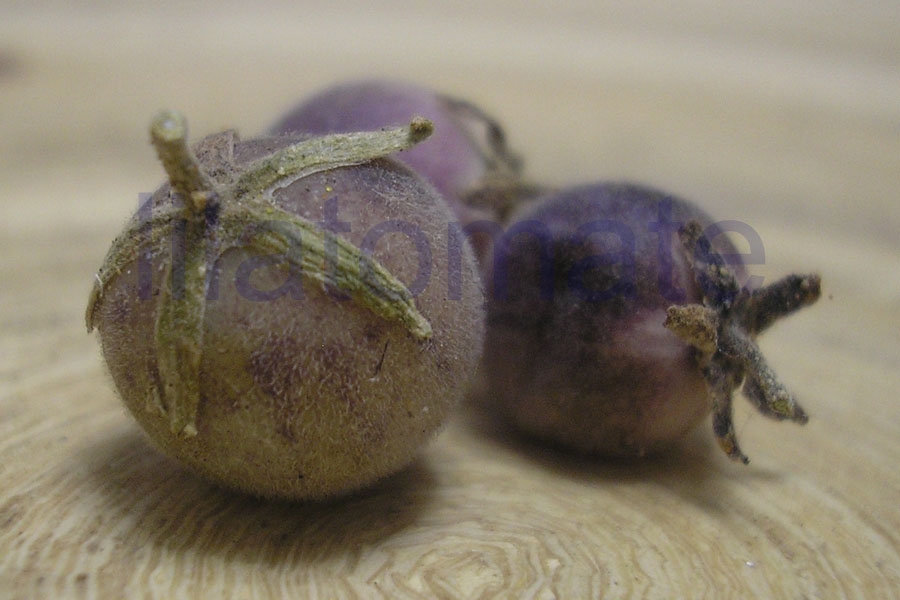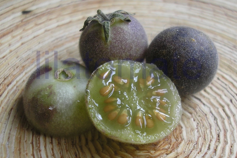 Unverwechselbar ist die 'Blaue Wildtomate'. Sie bildet blauweiße, schwach behaarte 0,5 bis 1cm kleine runde Tomaten, die bei Vollreife (mit blauen Backen) sehr angenehm fruchtig würzig schmecken. Unreife Früchte schmecken wie noch grüne, saure Stachelbeeren. Sie reifen allerdings gut nach. Die Ernte beginnt Ende Juli und endet mit dem Frost Mitte Oktober. Doch Ernte und Reife sind sehr vom Anbau und der Witterung abhängig. Für mich ist die 'Blaue Wildtomate' in erster Linie eine schöne Zierpflanze.