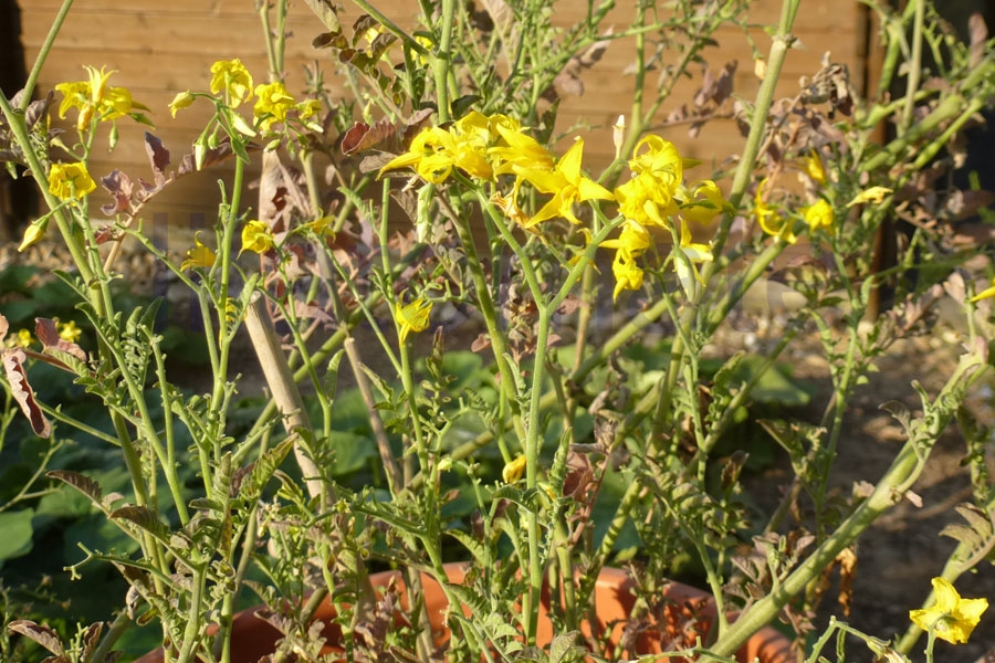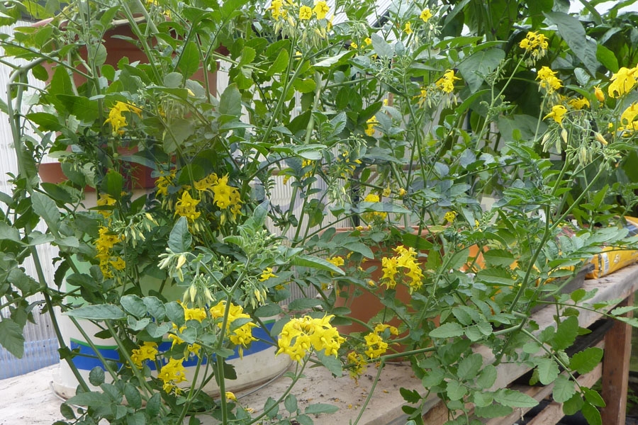 Die Pflanze selbst ist sehr schön: Die haarlosen Stängel und Blätter sind glatt und blaugrün, die büschelartig angeordneten Blüten leuchten grüngelb. Im Freiland wuchert die Pflanze kräftig bei über 1,5 m Höhe und derselben Breite. Sie lässt sich besser im Topf an einem geschützten warmen Standort halten, wird dort etwa 80 cm hoch und braucht nicht ausgegeizt zu werden. Für eine üppige Ernte sollte die Pflanze im Gewächshaus stehen und etwa 1 qm Platz haben. Aus Platzgründen setze ich die Pflanzen in Hochbeet oder in 12 -20 l Kübel in geschützten Lagen.