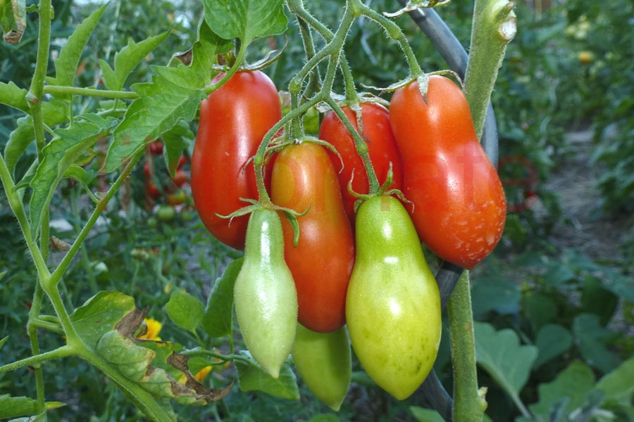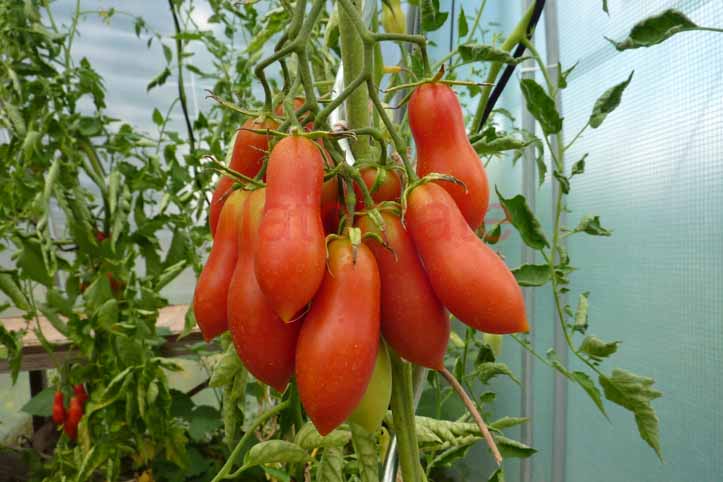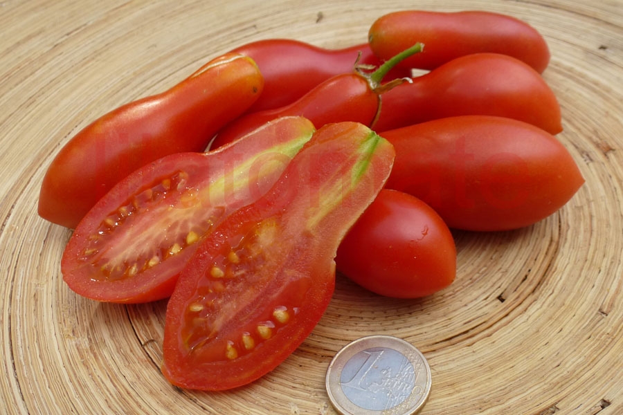 6 - 10 cm lange, leicht bauchig, 2 - 3 cm dicke rote, festfleischige Flaschentomate. Feiner, würziger, fruchtiger Geschmack. Der Ertrag im Freiland von Mitte Juli bis Mitte September ist sehr gut. Doch die Früchte platzen oft auf In kühlen Sommern geht ihr Ertrag zurück. Im Gewächshaus bleiben die Früchte unversehrt und die Ernte ist sehr üppig.
