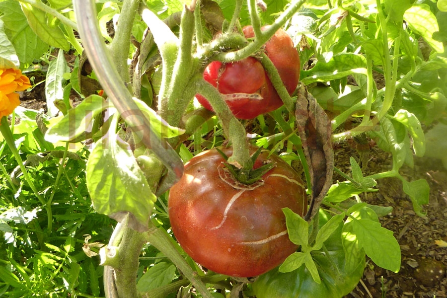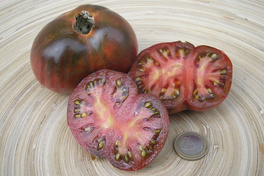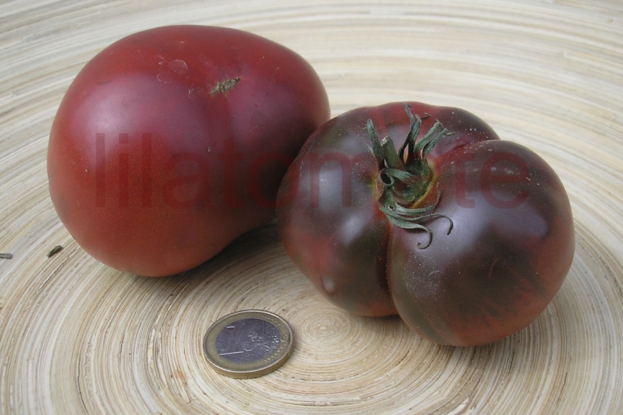 Eine frühe, 200 - 600 g schwere, flachrunde, rotbraunviolette Fleischtomate mit intensiv fruchtig-würzigem Aroma. Durch die dünne, weiche Schale braucht die 1,2 m hohe Buschtomate ein Regendach oder ein Gewächshaus. Ihr guter Ertrag beginnt Anfang Juli und endet Anfang Oktober. Im Freiland ist der Ertrag geringer und es sollte nur eine geschützte, warme Stelle mit Regendach ausgewählt werden. 2017 war ihr Ertrag im Freien gut und recht früh.