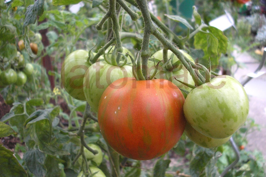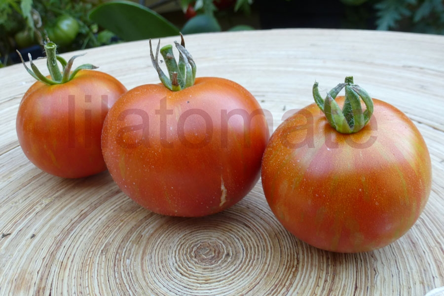 Mittelfrühe und lange tragende, mittelgroße, hübsche rote, braun oder rotgelb gestreifte Tomate. Gutes süß-würziges Aroma. Relativ platzfest, braucht ein Regendach. Manche Früchte sind weiche, manche sind fester. 1,8 m Stabtomate mit wenigen Geiztrieben. Die rotgelbgestreifte hatte 2022 einen guten Ertrag im Freiland.