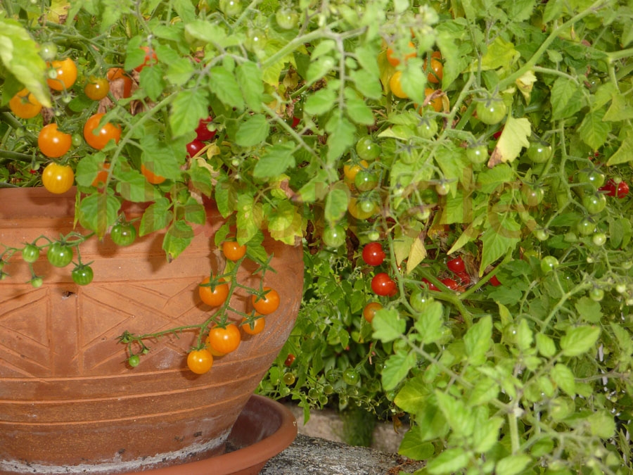 Ich pflanze gerne je eine gelbe und eine rote Johannisbeertomate in einen großen Topf und freue mich wenn die Triebe mit den unterschiedlichen Früchten bunt ineinanderwachsen.