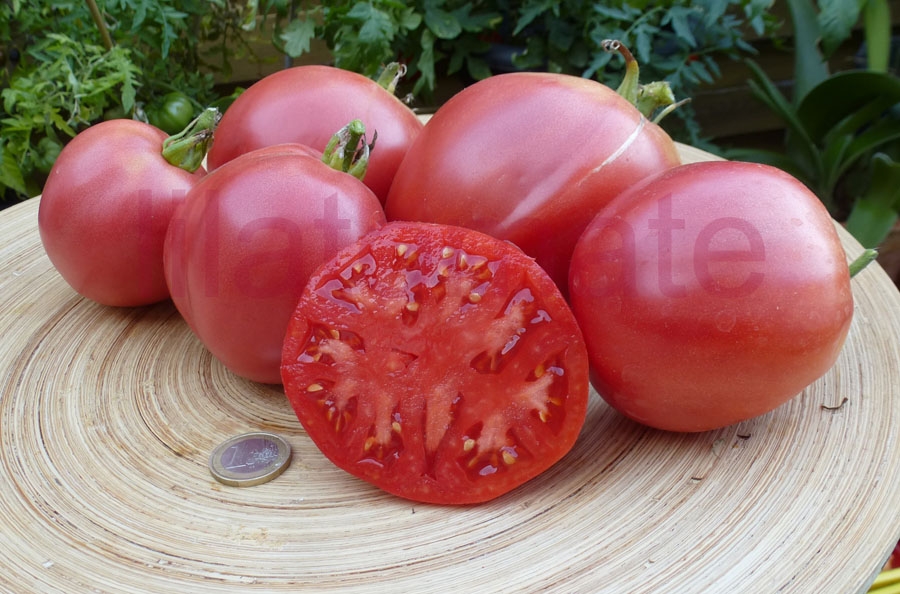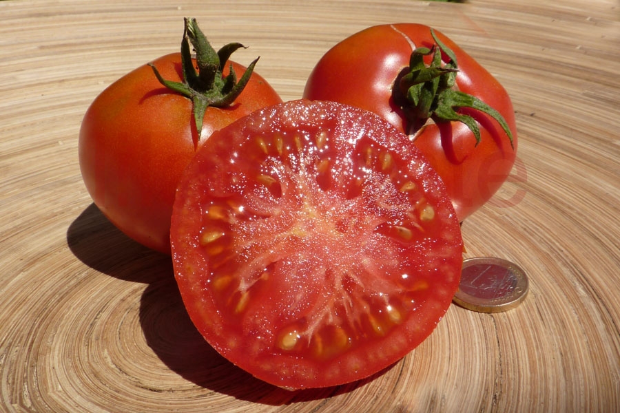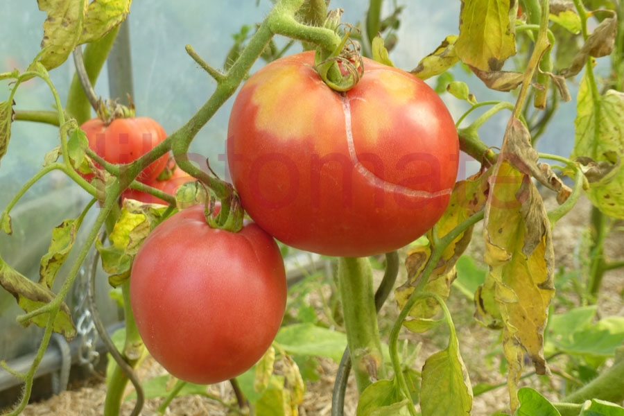 Eine 8 -12 cm große, flachrunde bis runde Mischung aus Ochsenherz- und Fleischtomate. Feiner, fruchtiger, süß-würziger Geschmack. Im Gegensatz zum Freilandanbau 2008, war der Ertrag im Gewächshaus 2013 früh von Mitte Juli bis Mitte September und reichlich. 2,2 m hohe Stabtomate mit wenigen Geiztrieben. 2015 wieder ganz gut im Gewächshaus. 2018 litt die Pflanze extrem im Gewächshaus und hatte bis Mitte, Ende August leider mehlige Früchte, davon viele mit Fruchtendfäule. Ab September gab es immerhin noch viele gesunde und deutlich besser schmeckende Früchte. Diese Sorte ist nichts für heiße Sommer in einer ohnehin schon warmen Region.