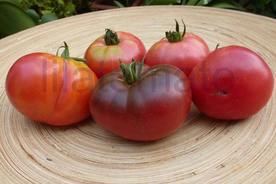Aromatische rotlila Fleischtomate mit interessanter Violettfärbung und gutem, fruchtigem Aroma. Die 1,4 - 2m hohe Stabtomate bringt einen mittelfrühen guten Ertrag im Gewächshaus. Die dünnhäutigen Früchte brauchen auf jedenfall einen Regenschutz.