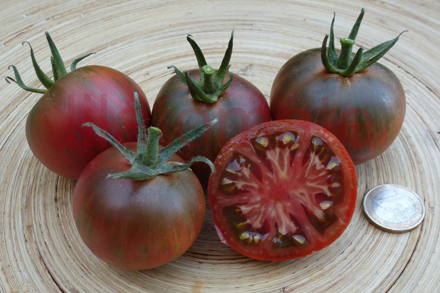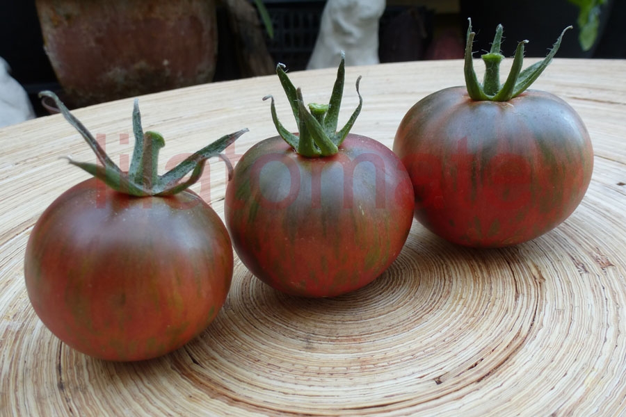 Wunderschöne rotviolette, braungrün gestreifte, 6 - 8 cm große, flachrunde bis runde Früchte mit sehr gutem, süß-fruchtigen Aroma. Eine meiner Lieblingssorten 2014 und 2016.