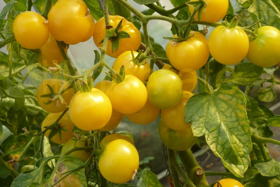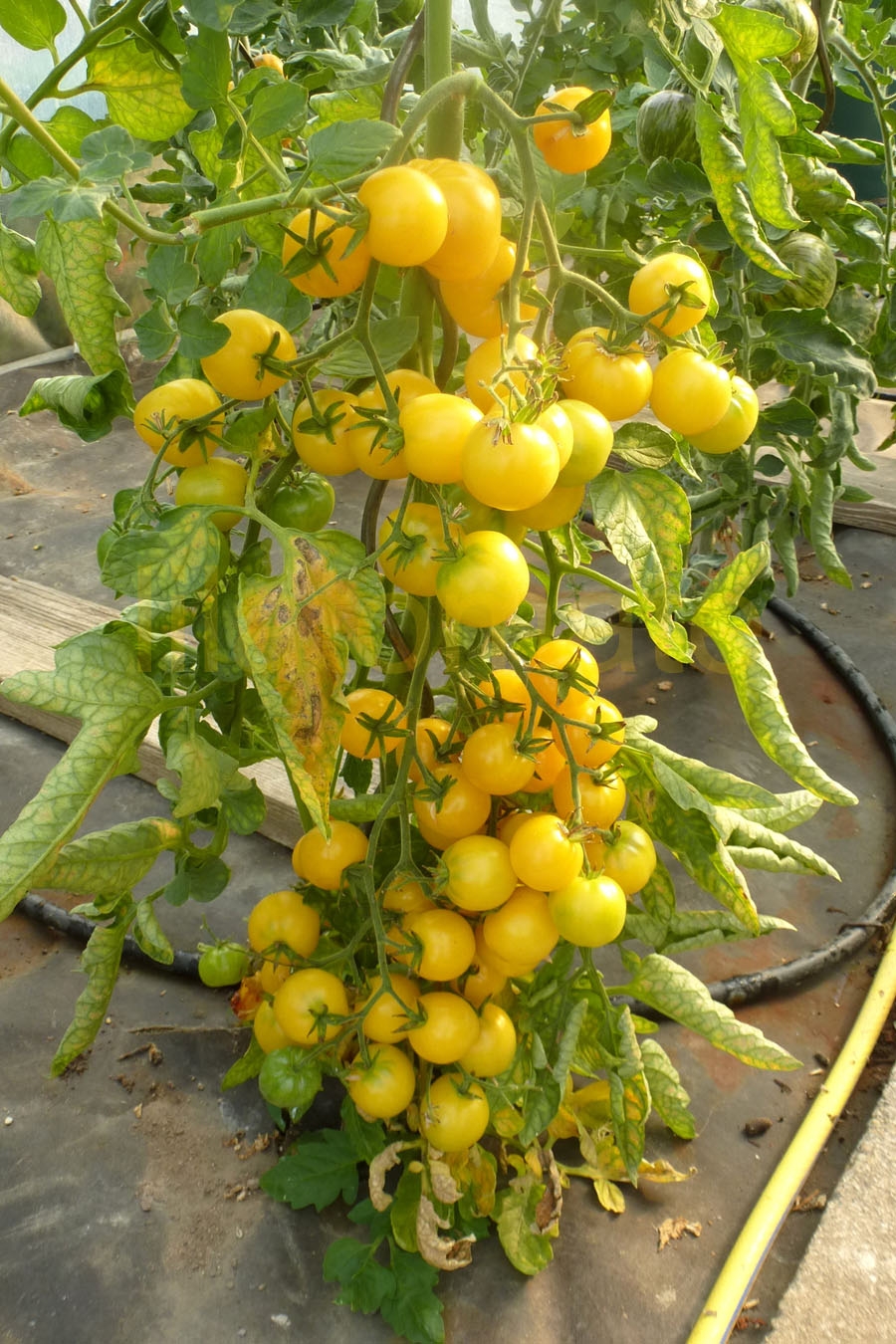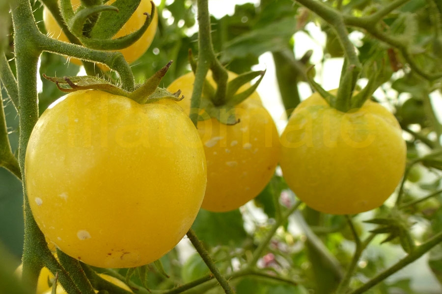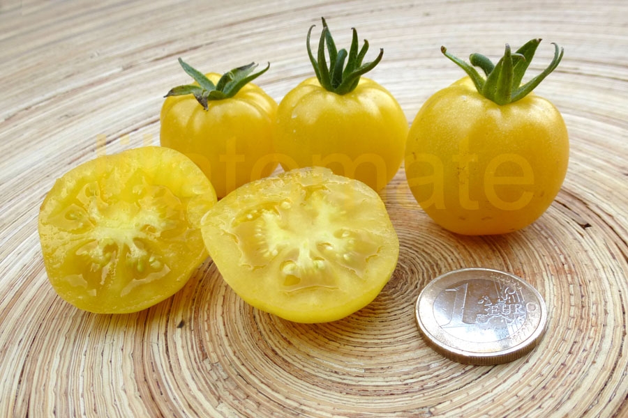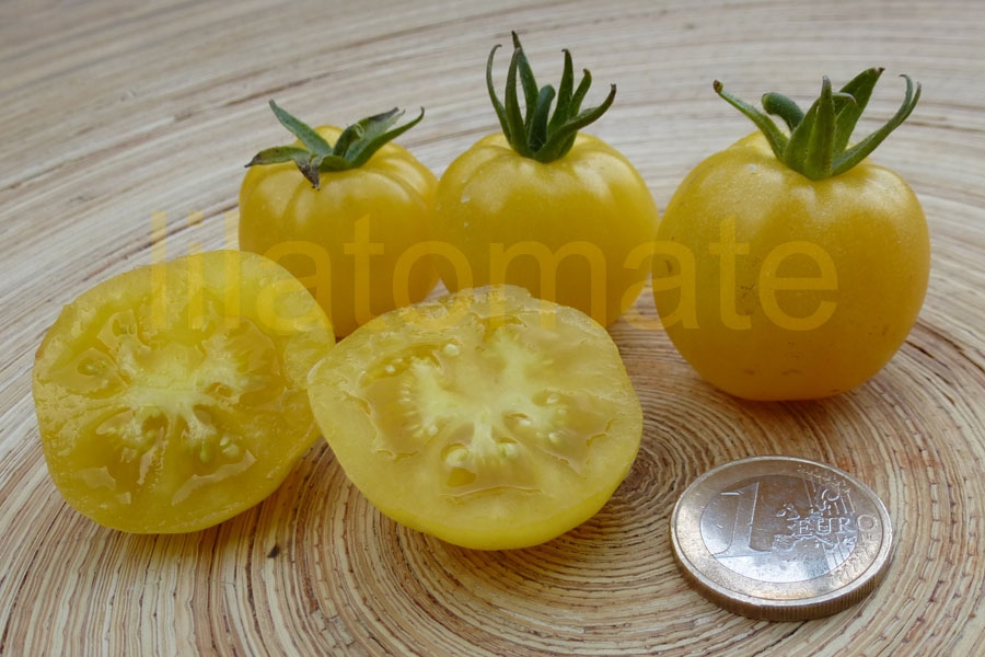 Sehr hübsche und leckere, cremeweiße, runde bis flachrunde Cocktailtomate. Die 2 - 3 cm großen, saftigen Früchte sind teilweise leicht gefurcht. Anders als im Freiland, brachte die Sorte im Gewächshausanbau 2013 einen sehr reichen Ertrag. Die Früchte sind erst bei den großen Temperaturunterschieden im Herbst zwischen Tag und Nacht aufgeplatzt.