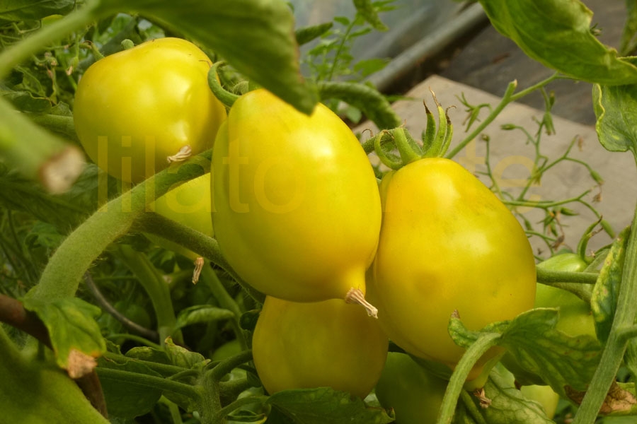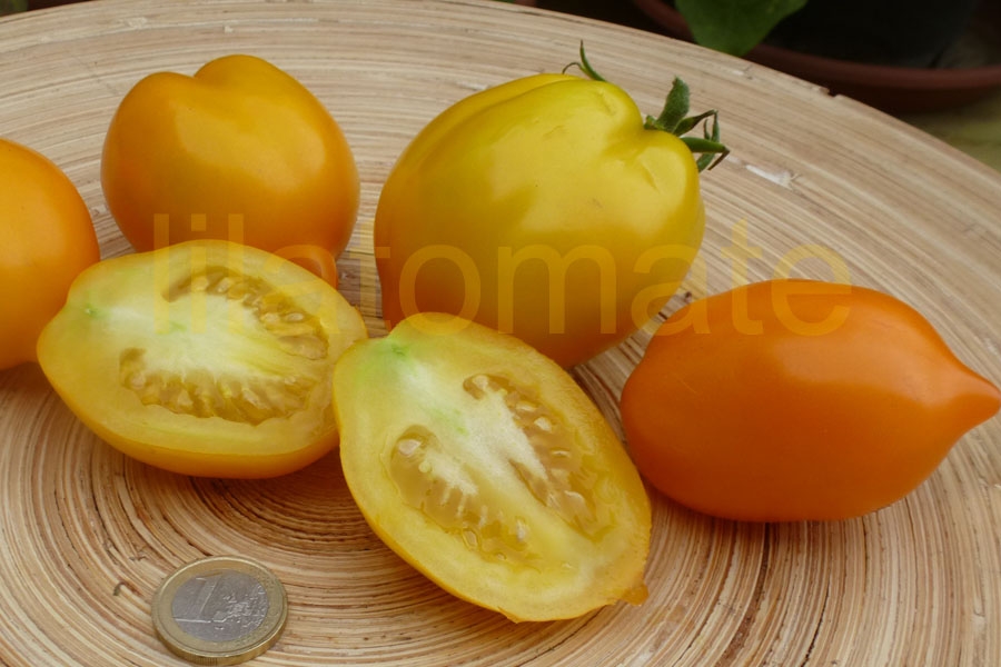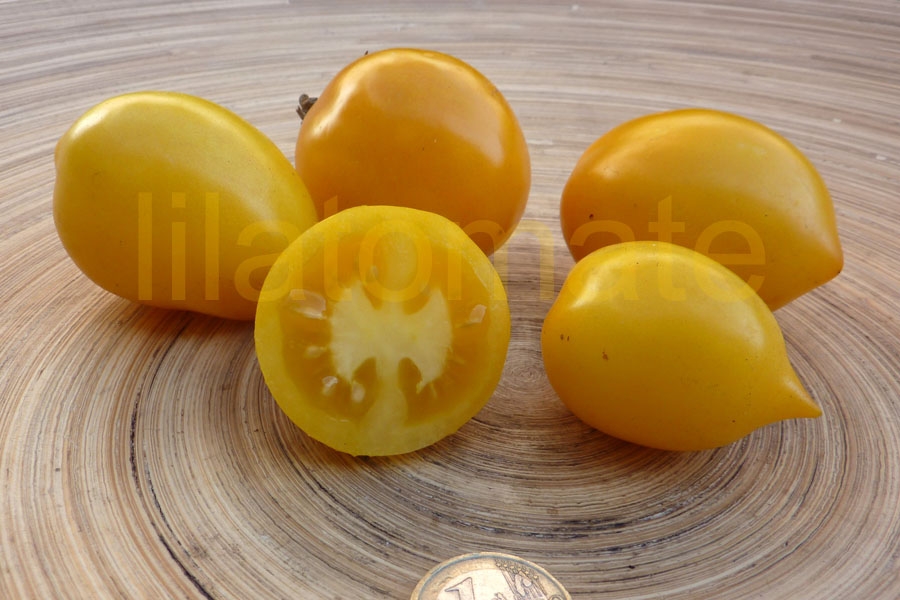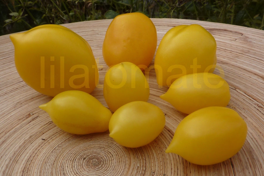 Milde, 5 -7 cm große, hellgelbe fruchtig-süße Tomate in Zitronenform. Unreif schmecken die Früchte fade. Sie sollten zum Verzehr leuchtend gelb sein. 2015 hatte ich im Gewächshaus frühe und riesige Erträge bis zum Herbst. 1 - 1,2 m hohe Pflanze. Nichts fürs Freiland – wird dort nicht reif.